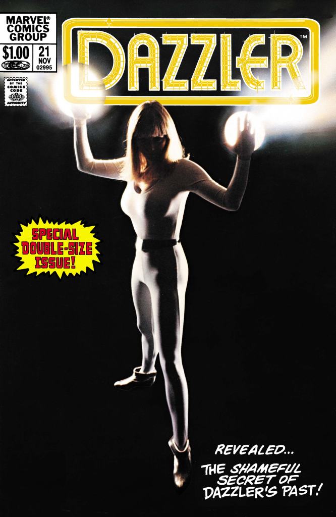 I also remember that back-issue bins and boxes would be full of Dazzler comics when I was a kid getting into comics. And one issue’s cover instantly drew my attention. As a photo cover I found it genuinely intriguing, so much so I bought the issue! I guess that’s just another illustration of why comics – whether on the front cover or on ripping off Diana Rigg’s “Queen of Sin” know exactly how to sell comics to teenagers!