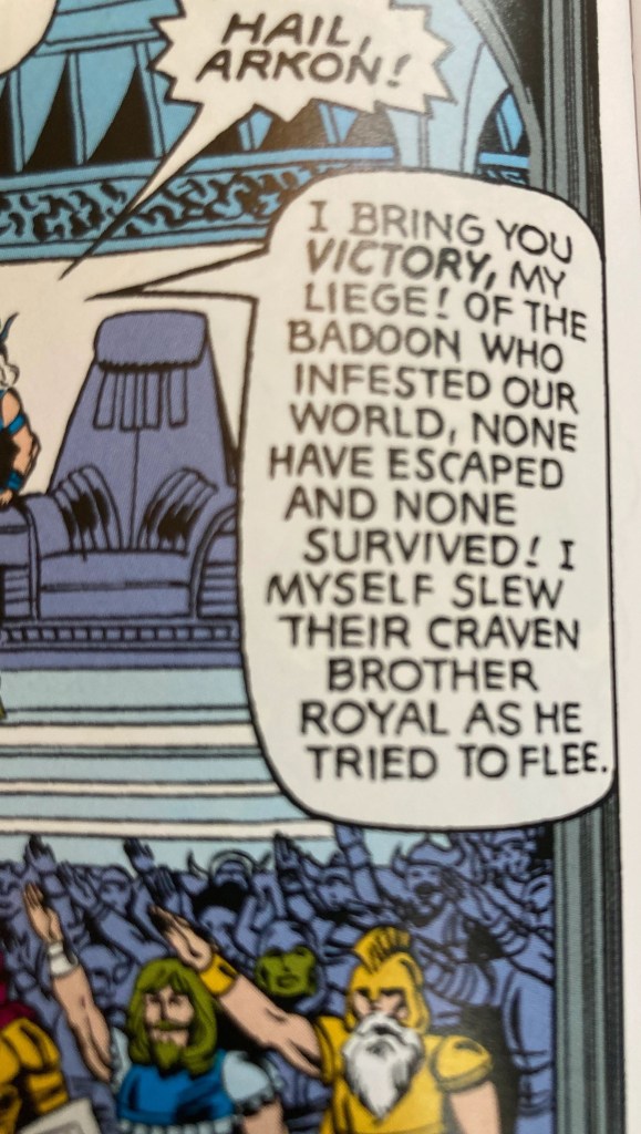 More disappointing this feels like a new peak in Claremont’s habit of telling key moments of the story ‘off-panel’. Throughout this issue there are important story moments that would be great to see, but instead we have to make do with being told. Including the actual defeat of the issue’s Big Bad Badoon Brother Royal.