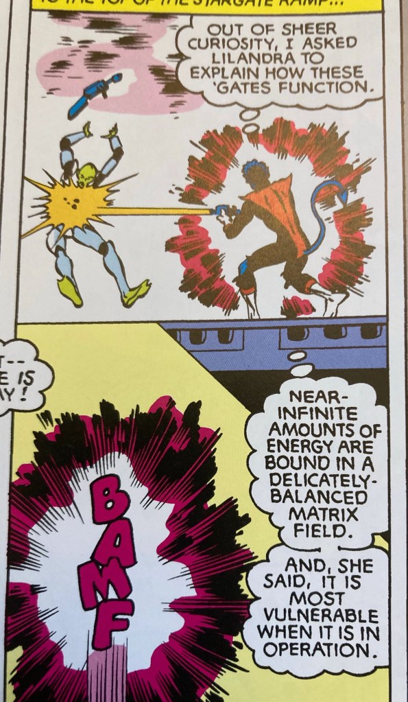 These narrative fill-ins also extend to convenient plot contrivances. Nightcrawler needs to explain how the Stargates can be destroyed. Luckily he conveniently asked a loads of questions about them earlier. No you didn’t see him do that. But he definitely did. As he tells us as he destroys them.