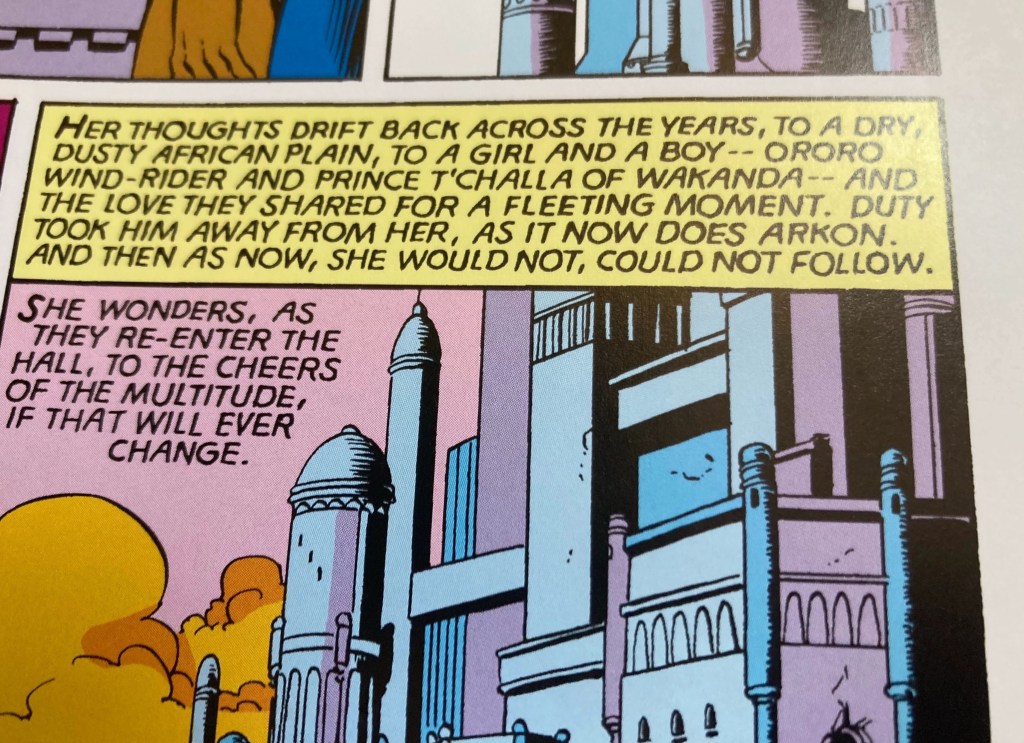Another moment where the issue’s narration seems to drop a massive bombshell revelation, shorn of any context. Storm and the Black Panther shared a moment together! Really? I don’t recall that in any issues so far.