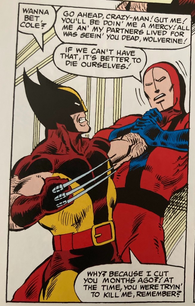The name “Cole”. Leading to a deep dive on the history of these characters that were to beomce Reavers. As a background detail, I didn’t appreciate how long a history this team of back-up thugs have and how their story with the X-men evolves.