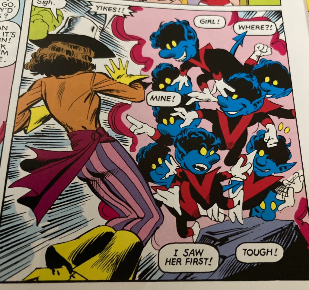 In the ongoing saga of Nightcrawler versus Wolverine, Nightcrawler clearly wins the battle of the cute fancy mini-versions. The Bamfs were to return far more in future.