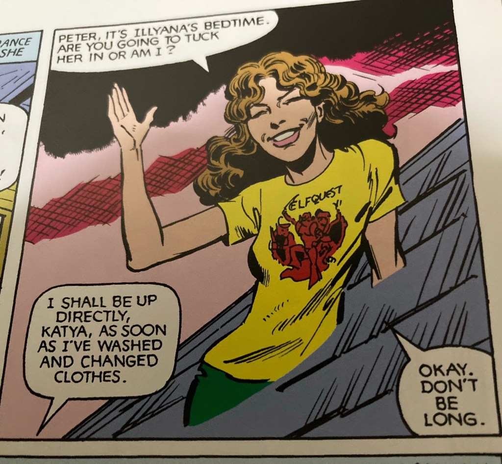 Kitty’s t-shirt clues the audience in to the type of story being told here. Elfquest being a big independent comic of the time. Created by Wendy and Richard Pini, Claremont ackowledges the influence not just with Kitty’s shirt but the appearance of a sprite called Pini in the story. A few years after this issue, Marvel was to start publishing the title, although the Pini eventually took it back to publish independantly.