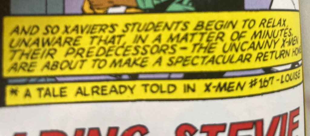 Thanks to the crazy world of scheduling – by the time this issue came out – Uncanny X-men 167 had been released, where the X-men return, meet the New Mutants and defeat the Brood infected Xavier. To readers at the time, this must have felt a bit like a prequel.