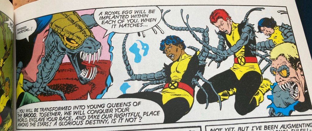 But aside from just setting up the Brood finale, there’s a really nice plot here for Psyche (urgh! still hate that name – when, oh when it it becoming Mirage). She is tormented by a Demon that might not be real, she learns to be wary of Xavier, she ropes in the New Mutants in secret and they take on a Monster that suggests her power potential is much greater than she realises.