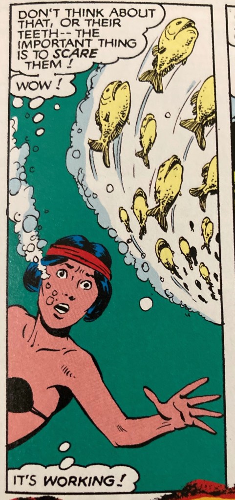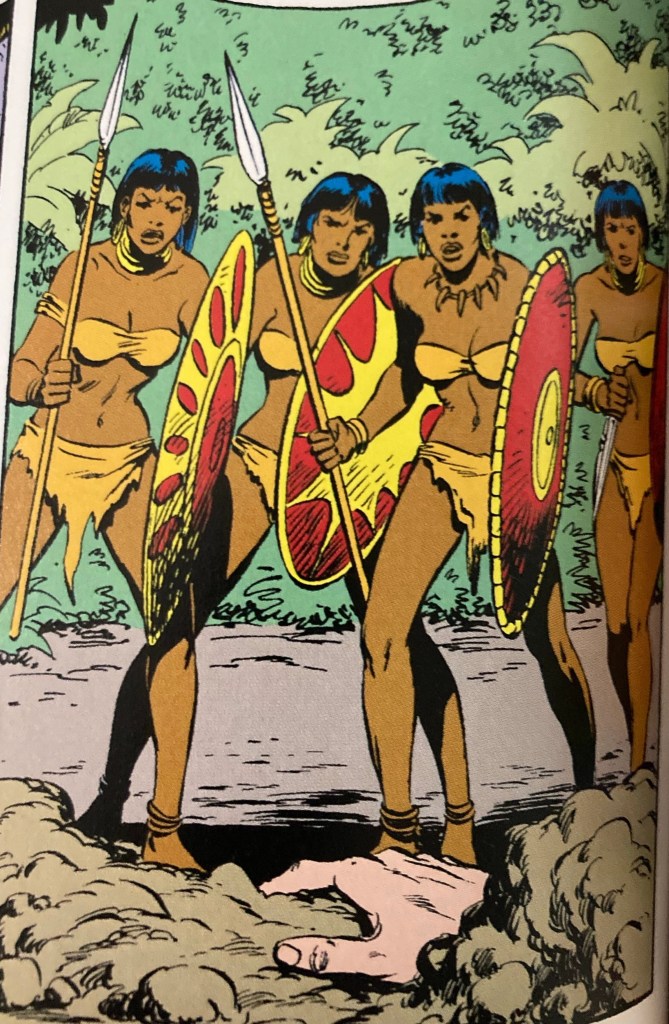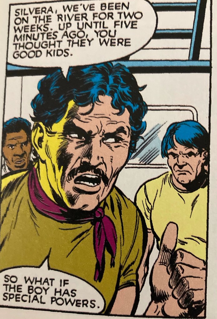 The core entertainment in this issue is its simple dedication to all the tropes of “Boy’s Own” Adventuring (Mutant’s Own?). The team are going exploring into the dark and mysterious core of South America. Travelling up the Amazon to explore brave new lands.