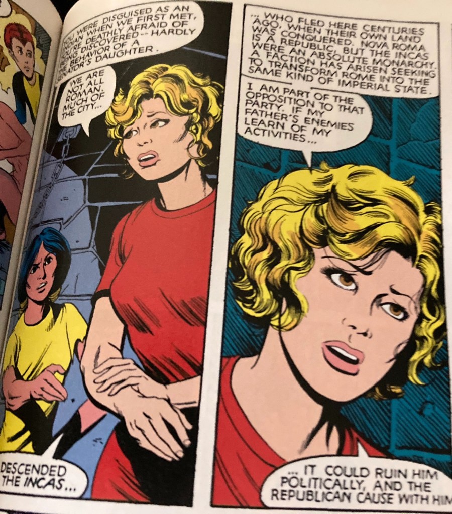 Which is a neat idea but then Claremont has the story tell us that its these pesky Inca. With their backward concepts of absolute monarchy, they threaten to utopian Republic the new Romans built.