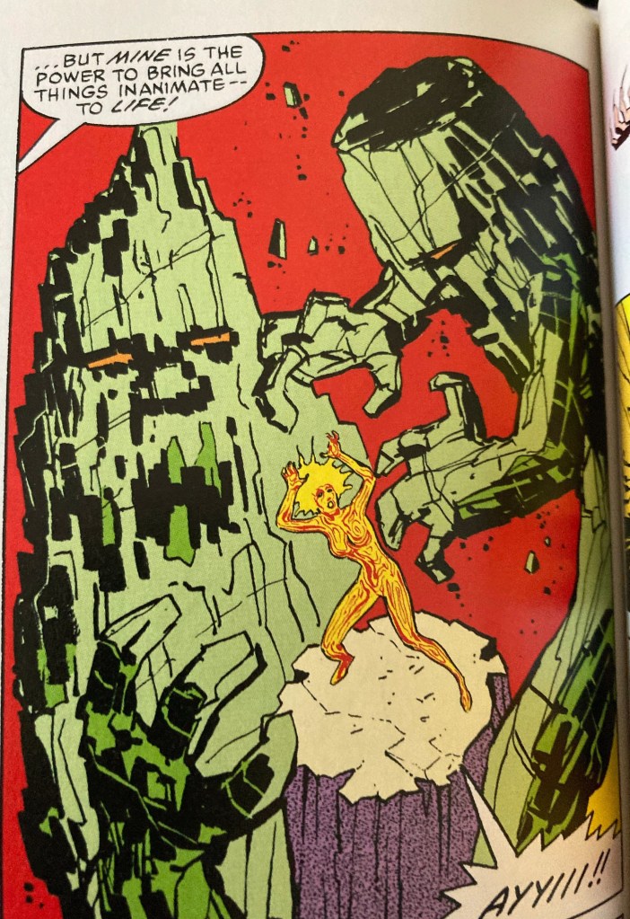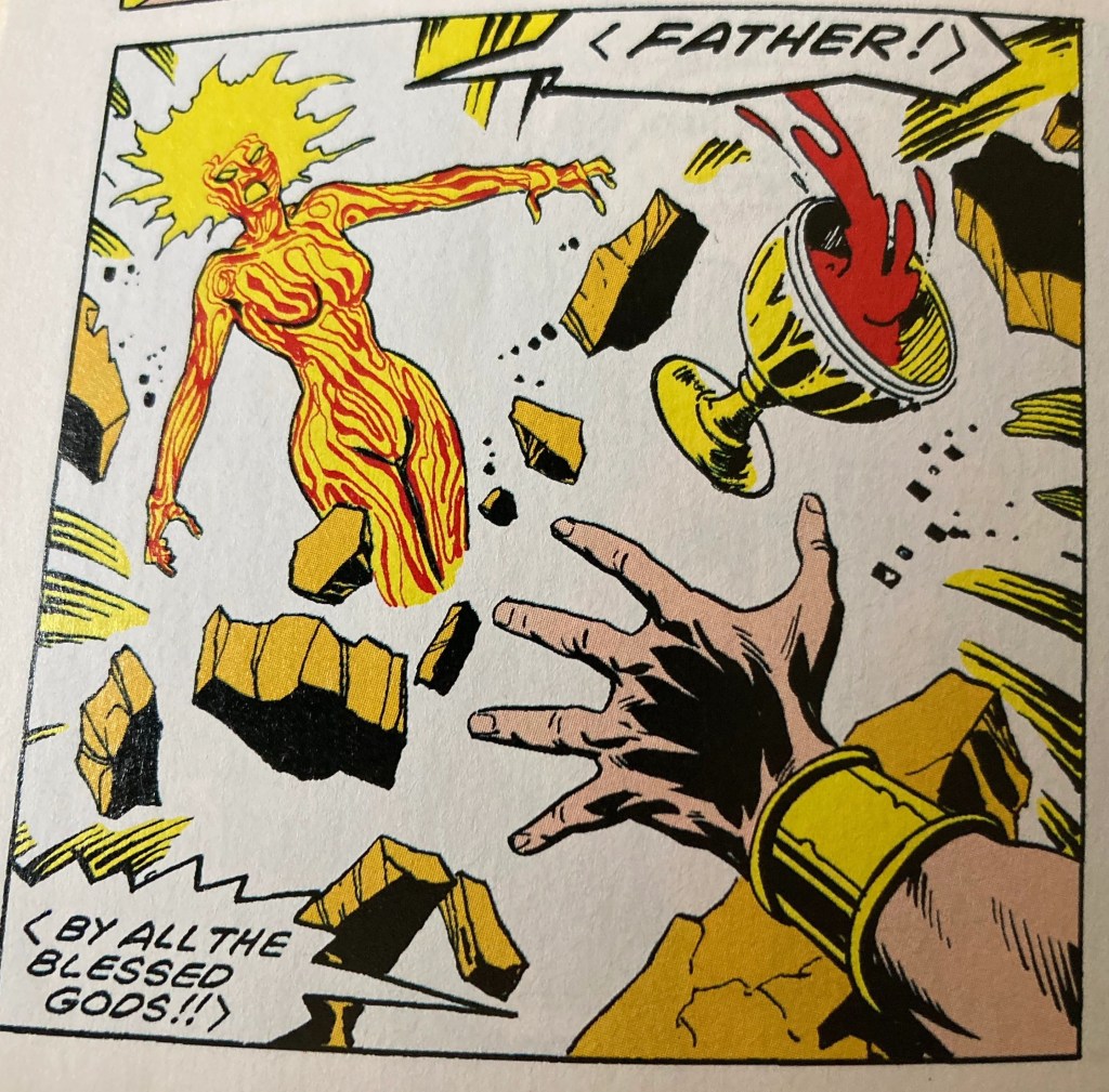 Every now and then its great to take time out when reading a comic and reflect on the image you’ve just looked at. And consider just how brilliantly barking mad it is. In this case, Girl who has just discovered her body can turn into Magma bursts in on her Evil Father, who happens to be plotting to make himself Emporer of a South American outposts of the Roman Empire hidden in the Amazon. Thereby thwarting his plan to poison a Boy who canfly by turning his legs into thermo-chemical energy.