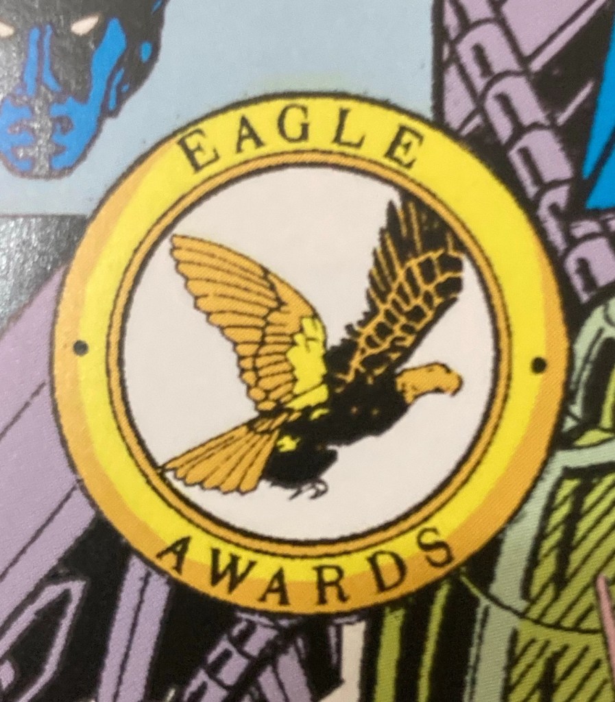 Both the front cover and letters page of this trumpet the fact that the comic has won an Eagle Award. It’s odd to see such an image, famous from UK comics in this period, on the cover of a US comic.