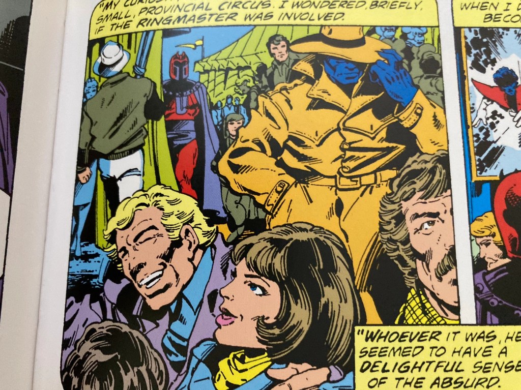 In the background of this panel – if you are keen eyed and quick-witted you might, just might, spot Magneto cleverly shadowing The Beast in a not-at-all-obvious manner. No wonder nobody in the circus battered an eyelid.