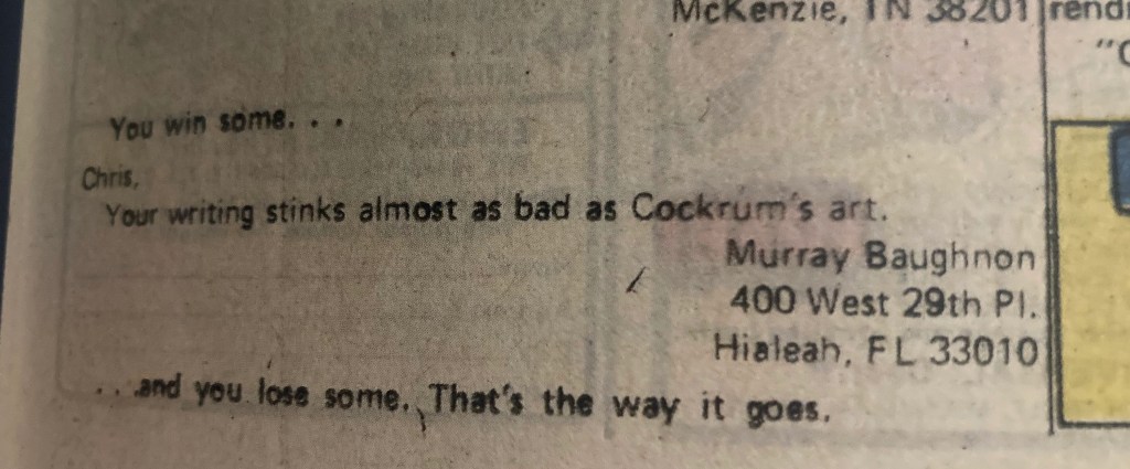 Sam Mandel of 353 Park Avenue, Highland Park, Illinois really doesn’t hold back in his complaints. Ditch the new X-men (bar Wolverine) by marrying off Storm and Colossus, killing off Nightcrawler and exiling Banshee. Also replace Claremont and Cockrum with “anyone”.